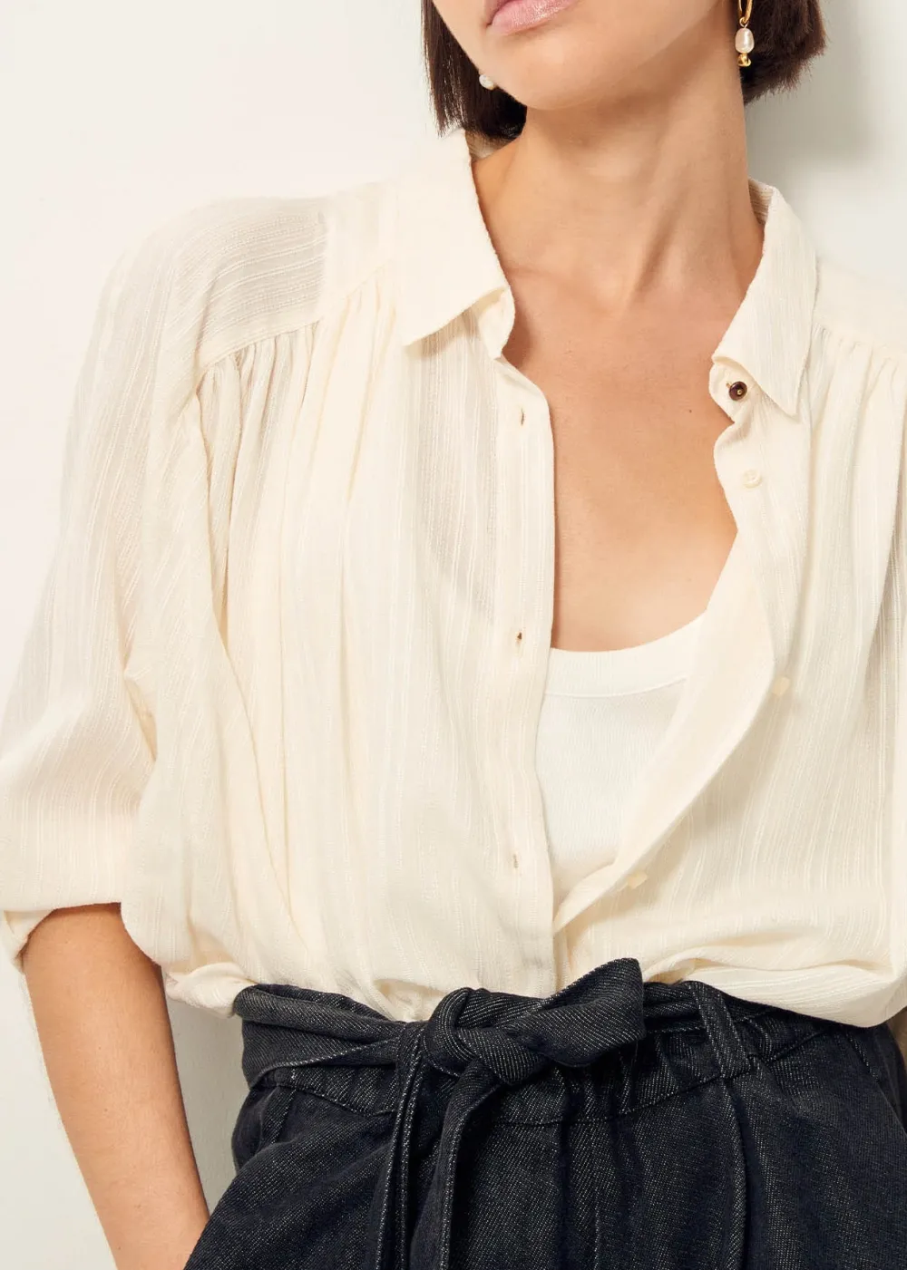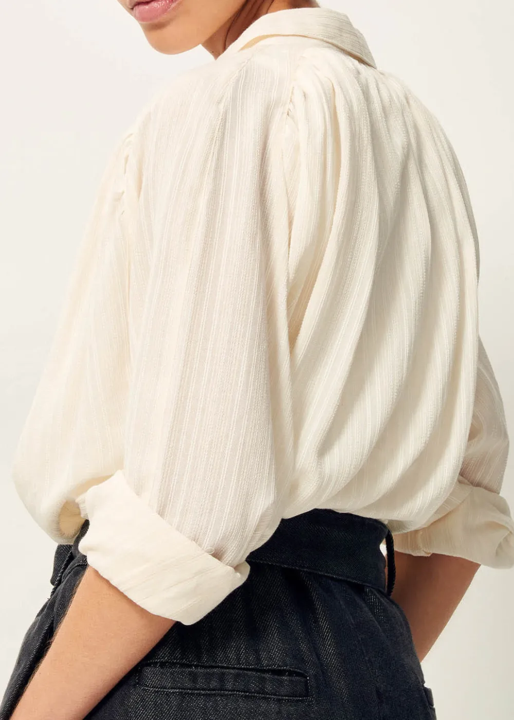 Loose-fitting shirt with raglan armholes and front and back gathered yokes in thin striped jacquard antic lawn, exclusive Sessùn.