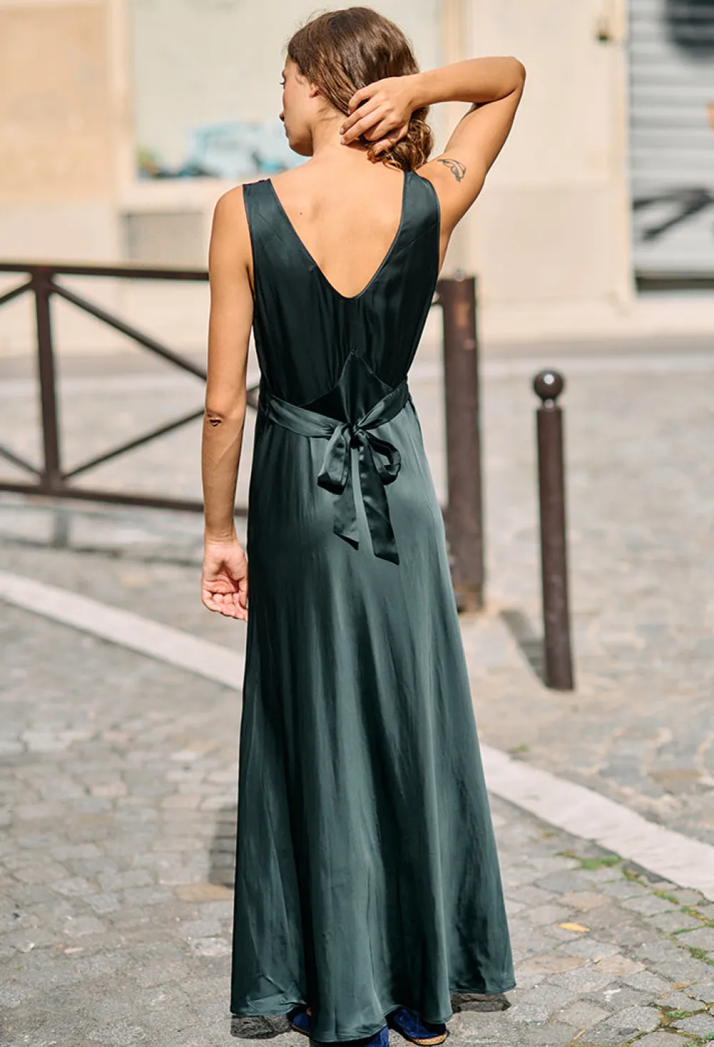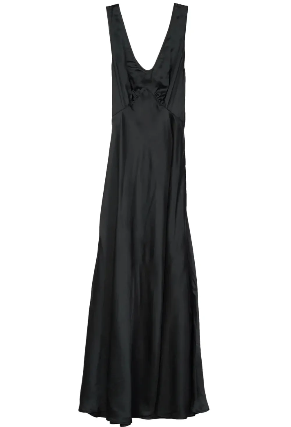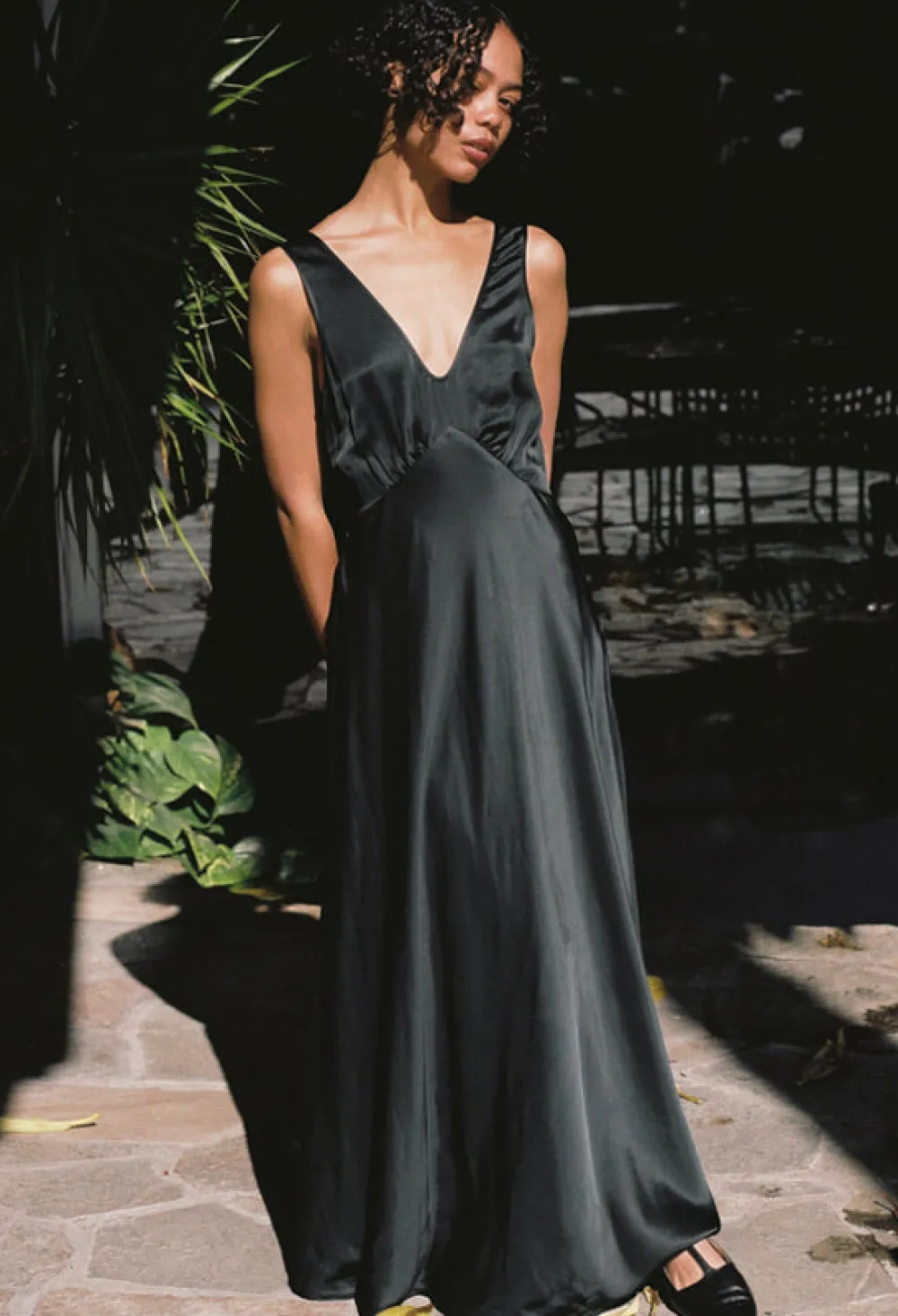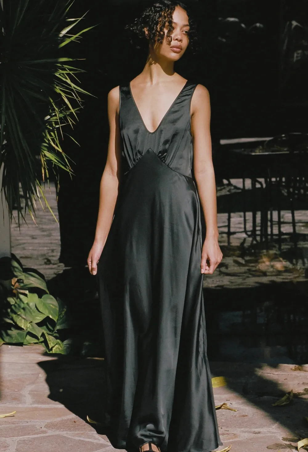 The Reine Dress in black is a sleeveless bias cut slip dress with tie detail at the back.