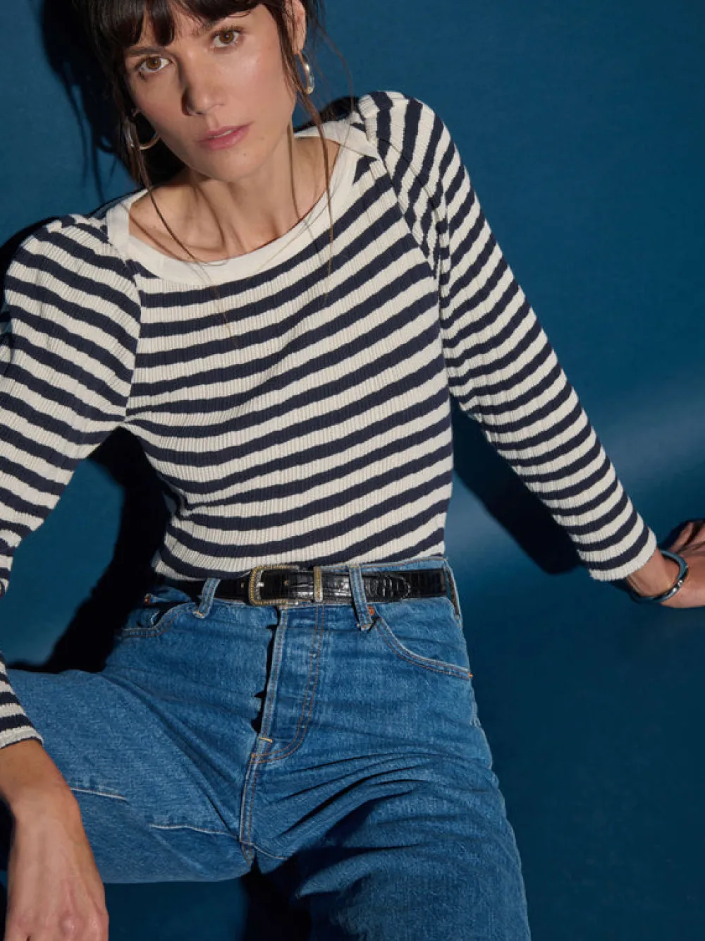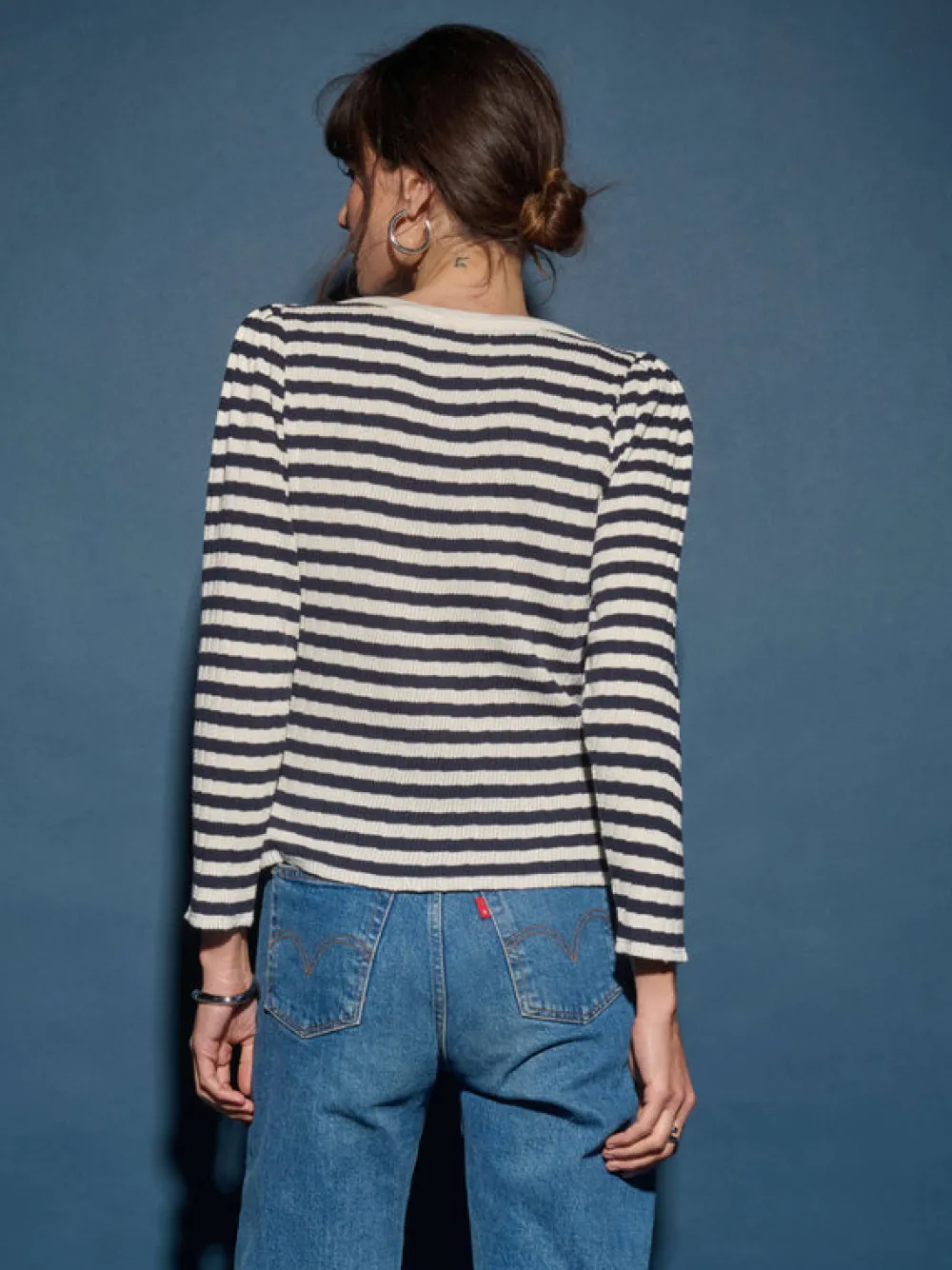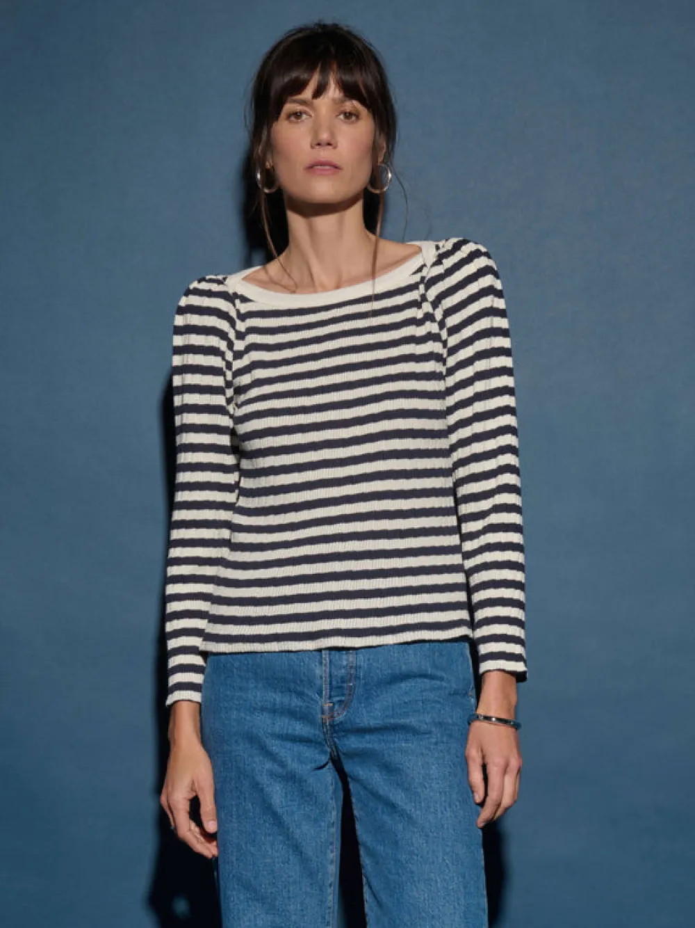 Envelope neckline, long sleeves, and a slim fit, plus subtle shoulder pads with knife pleats for a put-together look without the fuss.