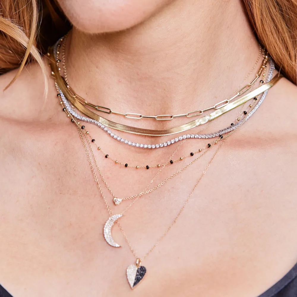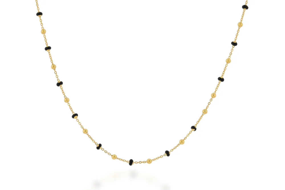 This 14K yellow gold necklace features a beaded satellite chain with black enamel dots. Perfect to layer with your other chains or necklaces.