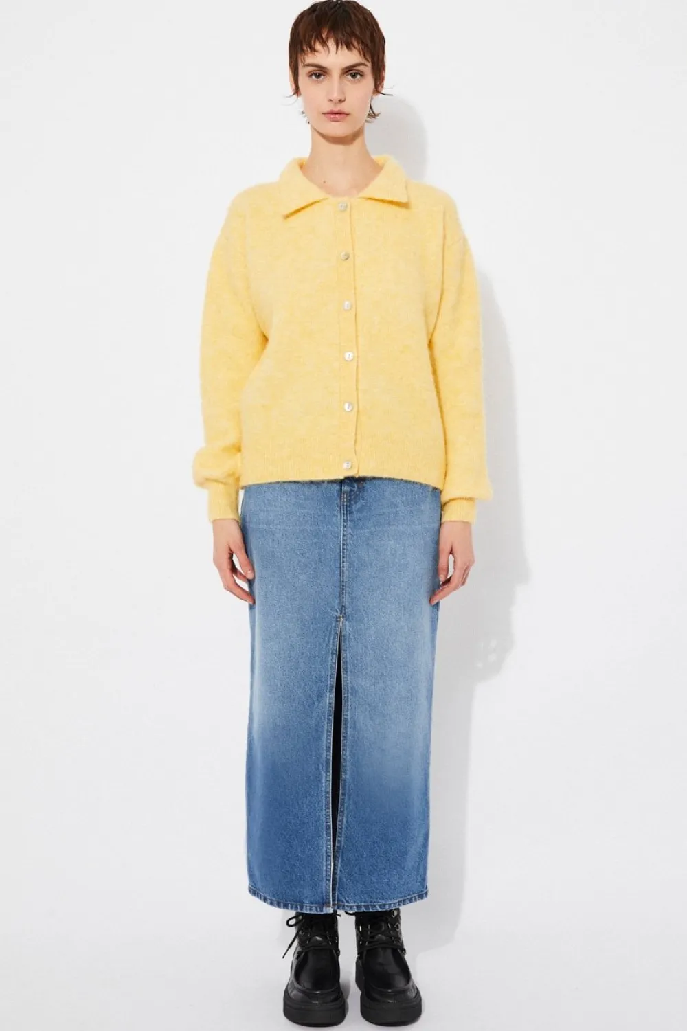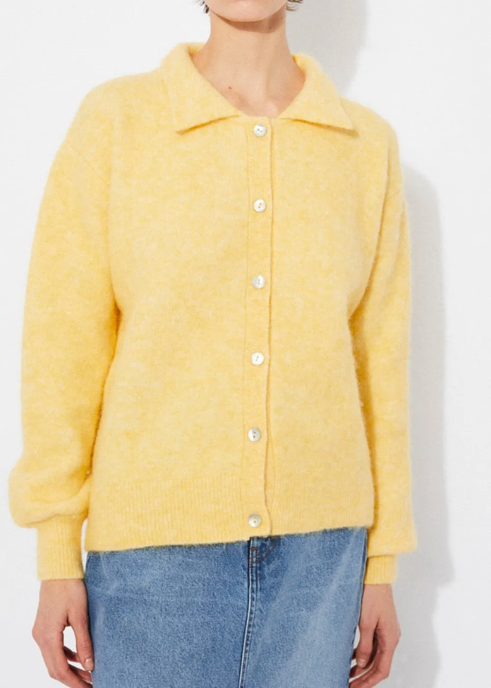 Straight cardigan in soft alpaca knit. Model with collar and front buttons.