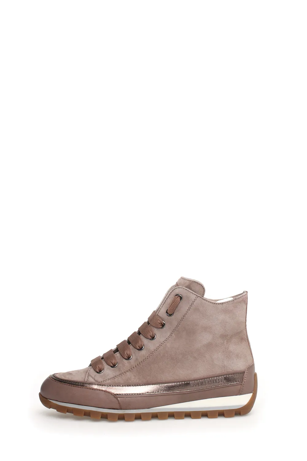 High ankle trainer in suede with padded leather base. Lace-up fastening and side zip. Thin rubber sole that rises to the heel.