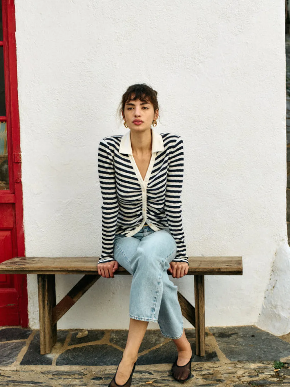 Proof that a collared long-sleeve can still be sexy. This top features a center-front placket with a V-neckline and a little ruching at the buttons for added shape.