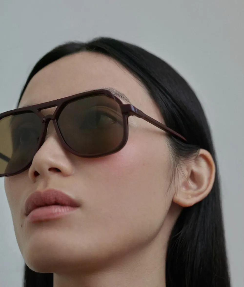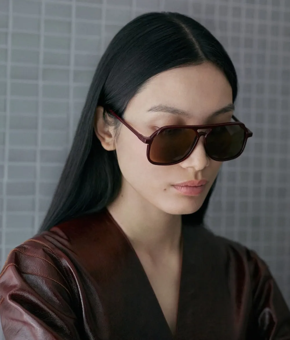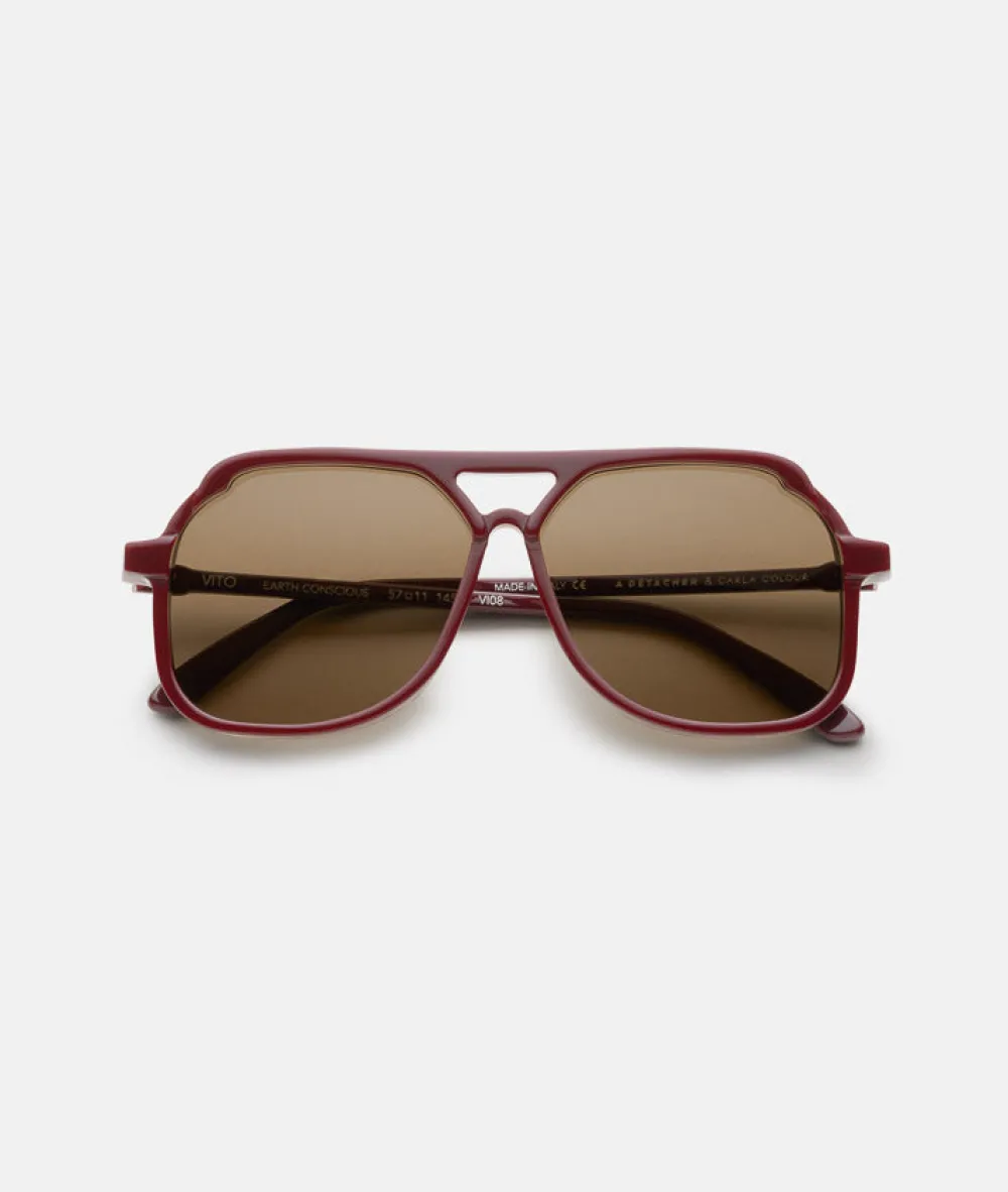 Deep red eco acetate frame with dark brown bio nylon lens.