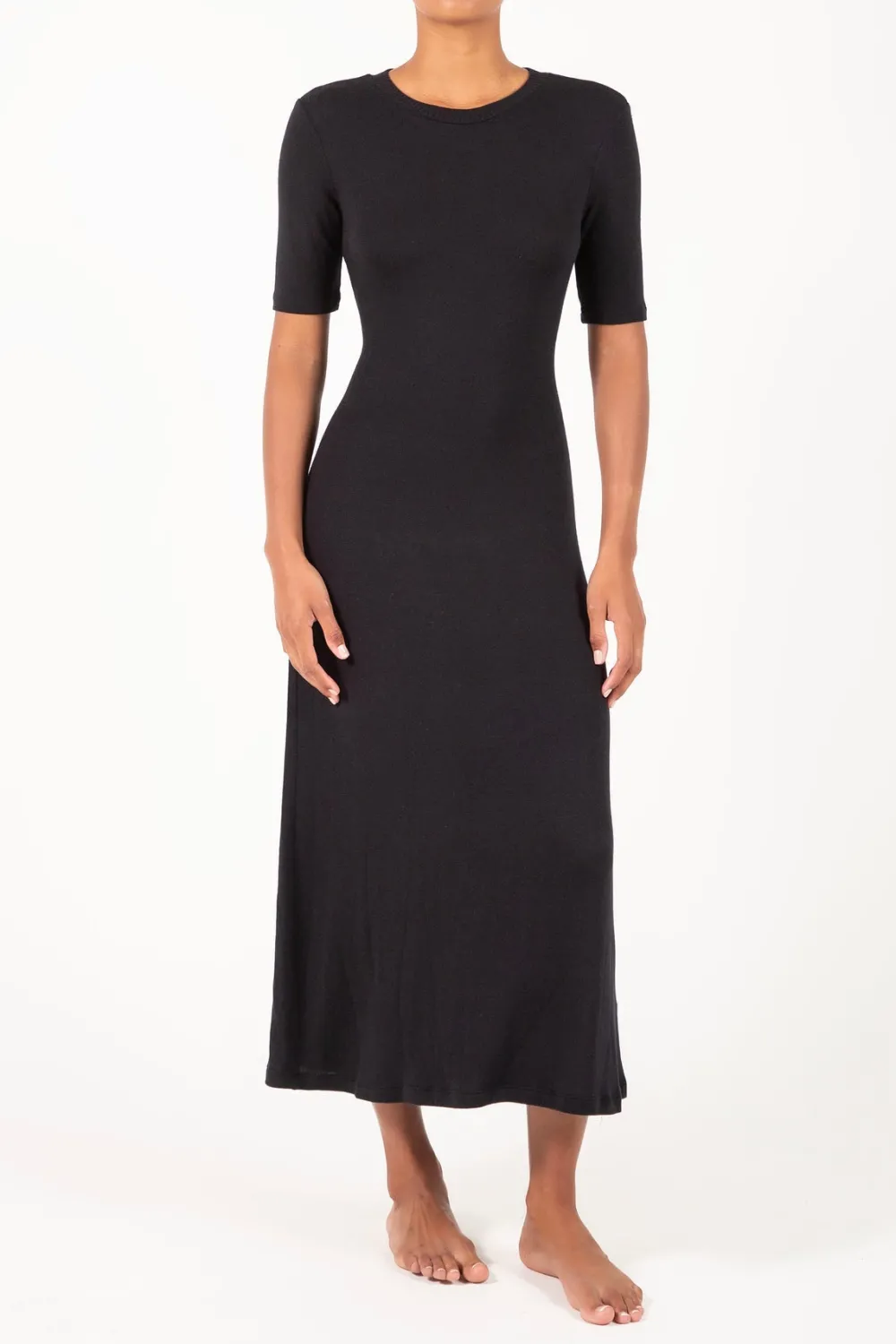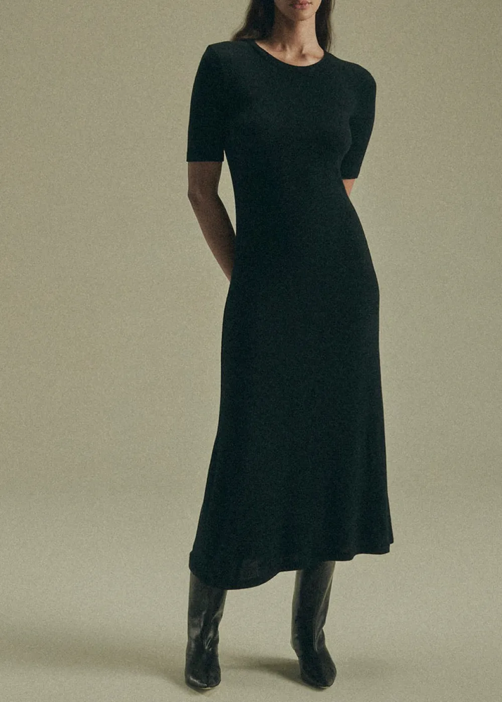 The sophistication and simplicity of the Short Sleeve Midi Dress delivers on the promise of the classic black column: a dress that is adaptable to any occasion and fits in seamlessly to your own personal style. With a sleeve that hits just above the elbow and the distinctive midi hem length, this look gives you coverage that feels uniquely modern.