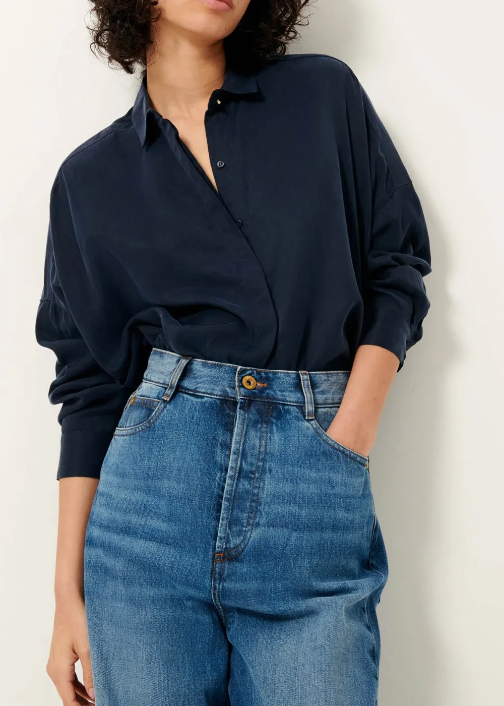 Loose-fitting shirt with drop shoulders in a cupro satin fabric.